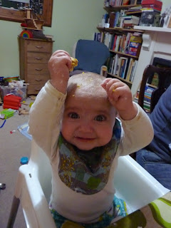 Isabel's latest trick is putting her hands in the air and then smiling cutely. The only problem is when she does it at meal times and ends up smearing her dinner all through her hair.